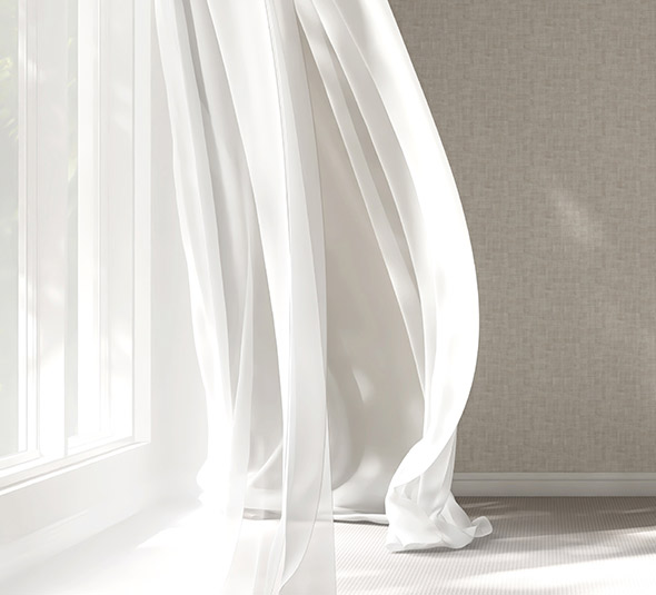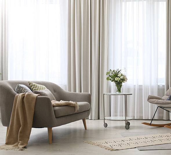 De gordijnstof en kleur bepaalt de sfeer in de ruimte.
